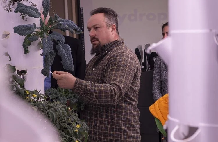The new lab at FMCC has 10 plant towers built by instructors and students, each growing various kinds of leafy greens. While students cannot grow cannabis on campus, they learn practical skills such as how similar plants grow in the towers.